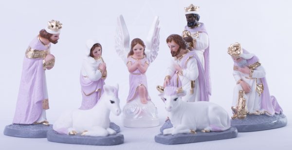 Nacimiento de 20cm Tradicional tono lila, hecha de yeso con ojos de cristal, 100% realizado a mano por artesanos mexicanos, cada figura que realizamos ponemos el corazón y el Alma en ellas.
