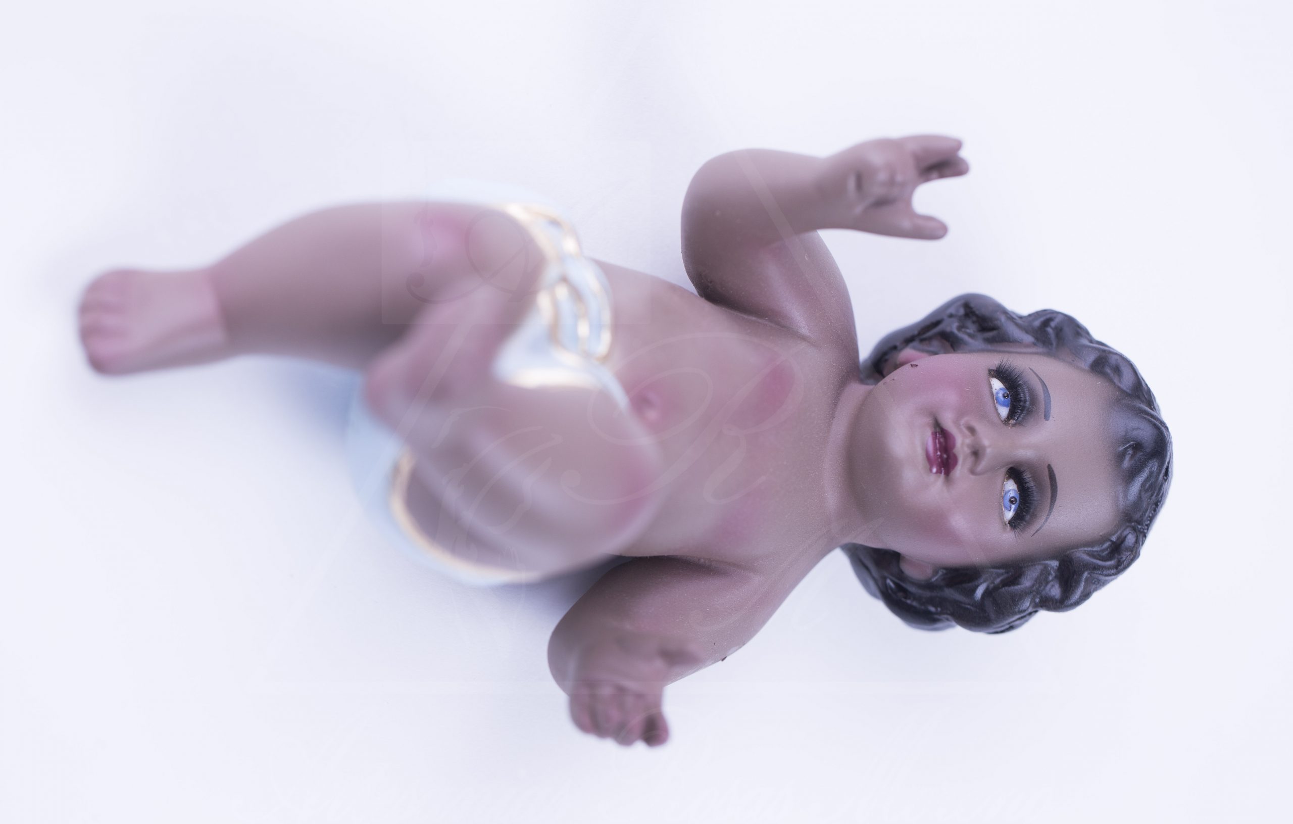 Niño Dios de 15cm moreno, hecha de yeso con ojos de cristal, 100% realizado a mano por artesanos mexicanos, cada figura que realizamos ponemos el corazón y el Alma en ellas.